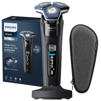 Philips Seria 7000 este un aparat de bărbierit electric performant care barbierește aproape ca o lamă tradițională. Are capete flexibile 360° care se mulează pe formă feței, tehnologie SkinIQ cu senzor care ajustează puterea în funcție de grosimea părului și lame auto-ascuțite. Barbieritul durează 3-4 minute și nu iritează pielea. Se poate folosi atât umed (cu spumă) cât și uscat. Bateria ține mult (6-7 bărbierite) și se încarcă repede. Vine cu stand de încărcare și toc de transport. Unele modele se conectează la aplicație pentru ghidare. Design modern, albastru glaciar. Unii utilizatori raportează iritații mai mari decât la One Blade, dar majoritatea sunt mulțumiți de performanță.