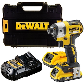 Mașina de înșurubat cu impact Dewalt DCF887D2-QW de 18V și 2Ah oferă 3 viteze, un cuplu maxim de 205Nm și 3800 RPM. Pachetul include 2 acumulatori, încărcător, clemă de fixare curea, adaptor magnetic și valiză profesională TSTAK. Este apreciată pentru puterea și eficiența în lucrări casnice, deși acumulatorii de 2Ah pot fi insuficienți pentru lucrări intensive. Produsul este considerat de calitate, cu materiale durabile.